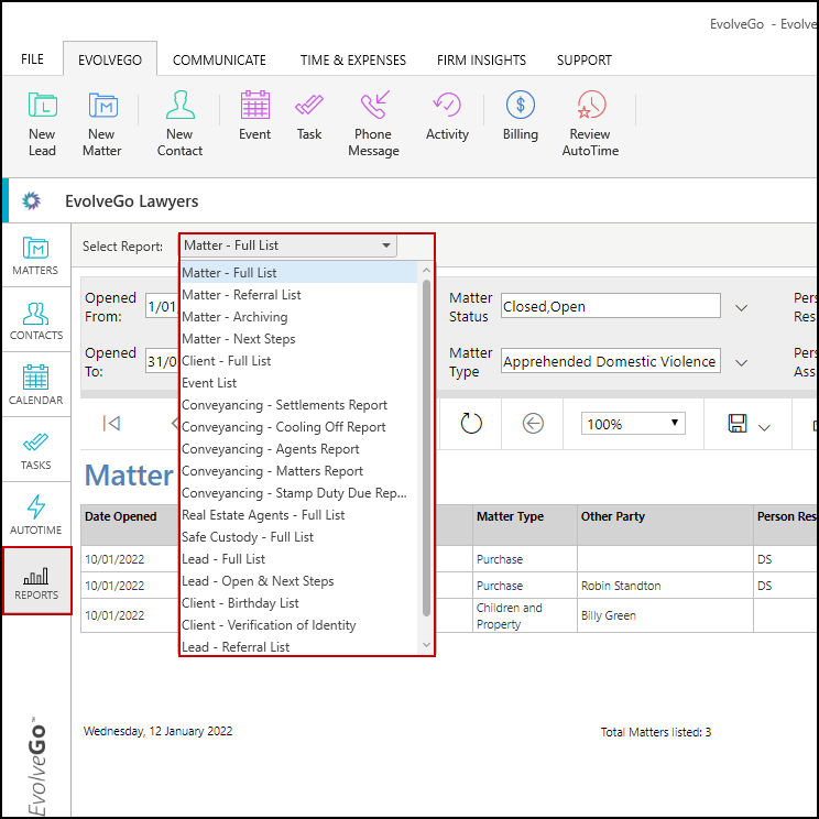 2. From the drop down menu select the required Report.