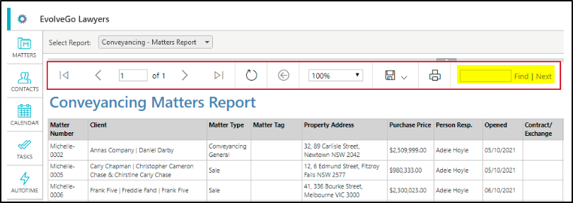 6. The action bar can also be used to search the contents of the report. This is done via the "Find I Next" box (highlighted above).