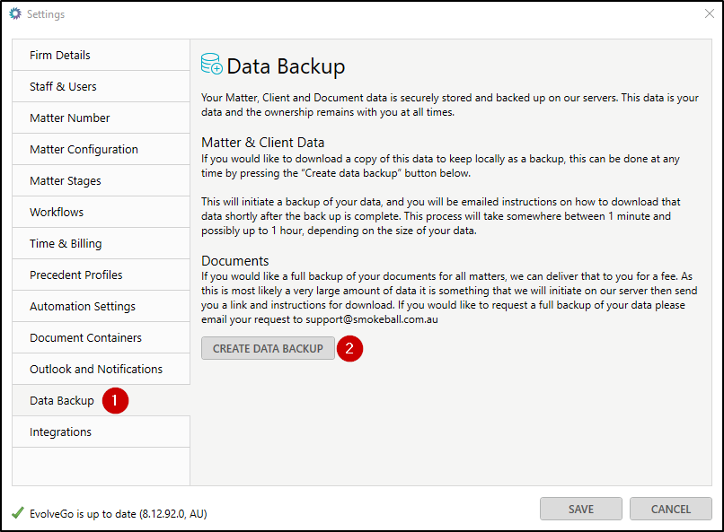 Your EvolveGo matters, contact info, and documents are securely stored and backed up. If at any point you wanted to create a local "copy" of your data, you can do so by navigating to the application Settings, selecting Data Backup (1) and selecting "Create Data Backup" (2). If backing up your EvolveGo data is important to you, be advised, depending on how much data you have in EvolveGo, creating a local data back up may take a long time and use a lot of your computer resources.