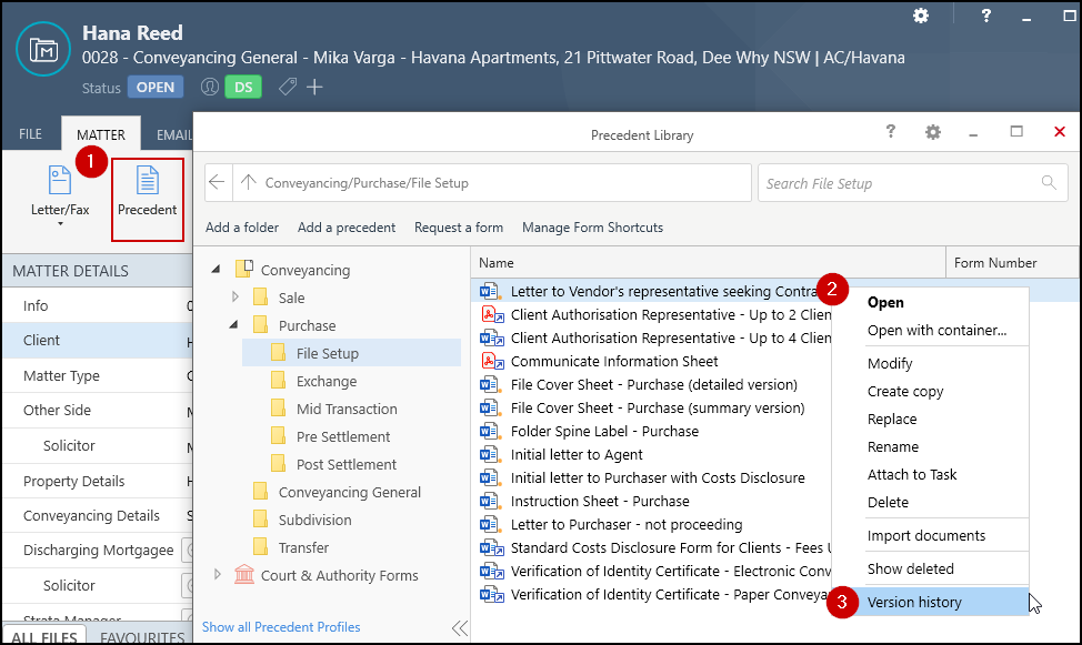 1. Access the Precedent Library and navigate to the precedent you need to revert.