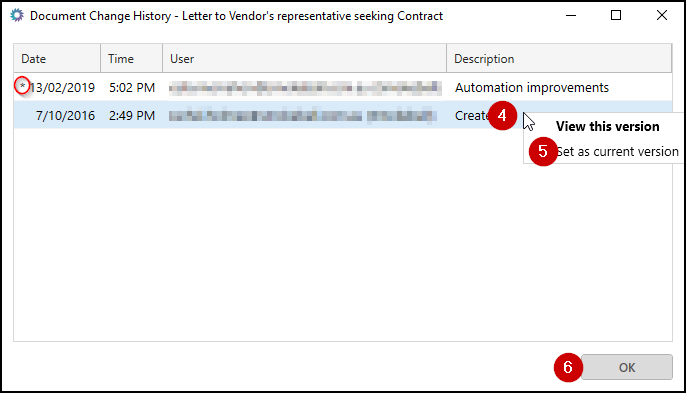 The Asterix indicates the current version of the document. When you open this precedent in future, it will open with the version that you have selected (displayed with an *).