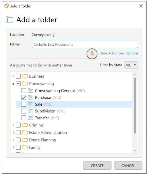 - Advance option: you can associate the folder with different matter types so that it is shown as a relevant folder in those matters