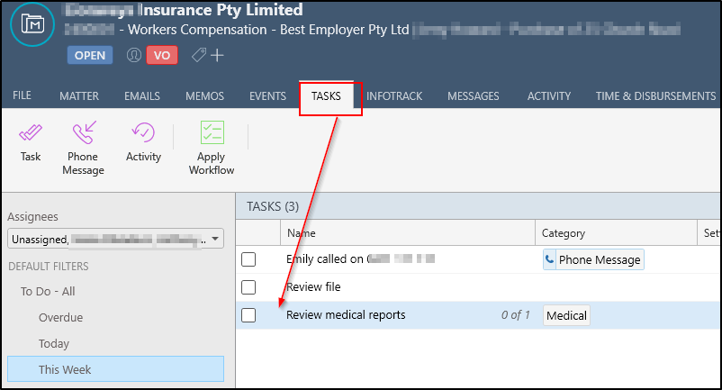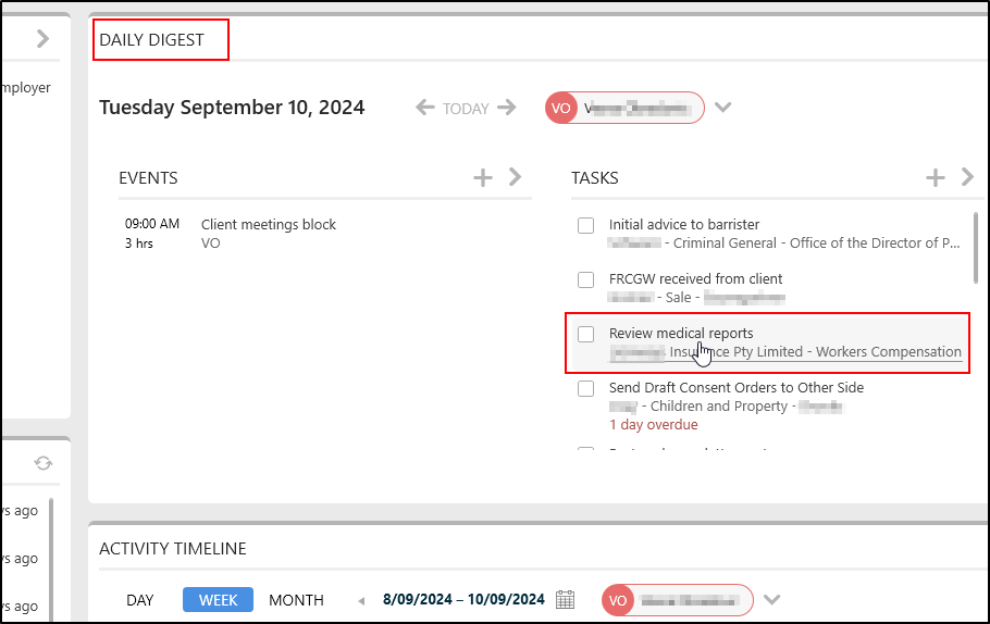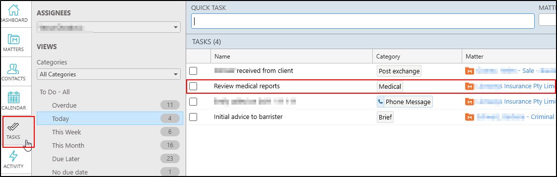 Once you have created a task, it can be viewed from the Tasks tab on the matter, and also from the Task view and Daily Digest: