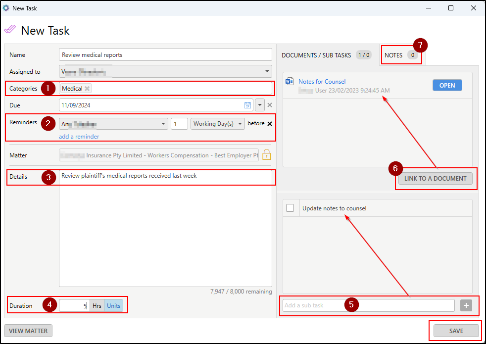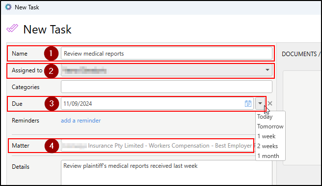 4. Matter: Because you have created the task from within a matter, the current matter details will auto-populate.