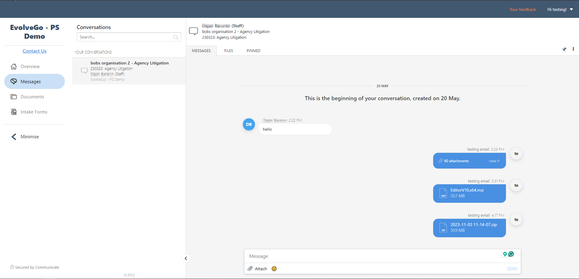 2. Click on this button to bring up the Communicate screen. Here you will be able to send your lawyers messages, and use the attach button to send files and documents.