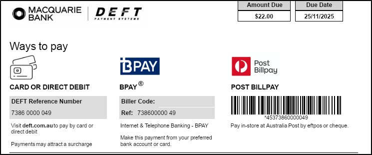 The same BPAY reference number will also appear on your bank statement when a client makes a payment through the DEFT Payment System, ensuring seamless reconciliation and payment tracking.