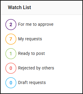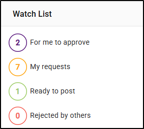 The Watch List widget provides an overview of the status of invoices, requisitions and matter to matter transfers that have been submitted for approval, and where they currently sit within the approval process. By default, the Watch List widget will filter to the Approvals options, which are: