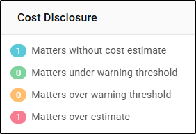 The Cost Disclosure widget provides a snapshot of the number of matters at the various stages of Fees to Estimate status, bringing to the user’s attention matters where appropriate action and relationship management needs to take place. Each matter is placed into its highest risk category. By default the list will filter to show matters where the user is the Person Responsible.