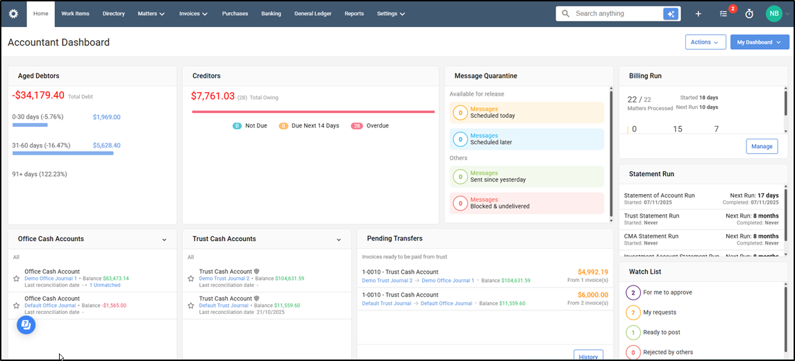 Allows the accounting team to manage the firm’s cashflow, perform debtor management, approvals, banking, and keep an eye on system activities such as automated messages, billing, and statement runs.