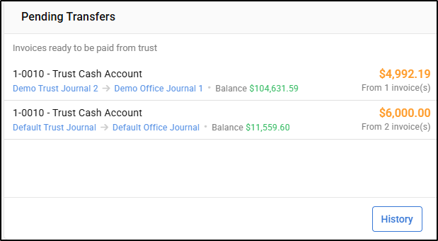 For each Trust Cash Account, you can also see the balance of the Trust Cash Account in green and then over to the right a total value of transfers available to make for that account and a number of Invoices the total value is made up of.