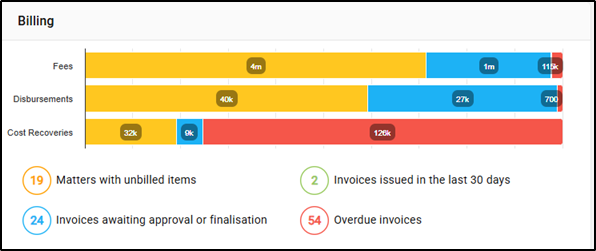 The Billing widget provides two separate points of view of the status of unbilled and billed, fees and disbursements. The bar graphs serve as visual indicators of the quantum of fees or disbursements at each stage of the billing cycle. The billing cycle stages titles, provide a number indicating how many matters are at each stage of the billing cycle. By default, the widget will show figures for matters where the user is the Person Assisting.