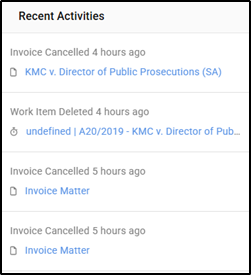 The Recent Activities widget shows a list of recent actions taken by the user. A hyperlink back to the item created, updated or cancelled is available, providing a quick access shortcut to get back to the item.