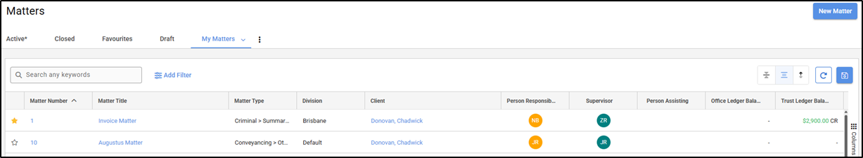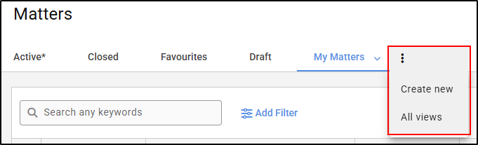 Selecting one of the categories will open a matters listing screen filtered to only show matters within that category.