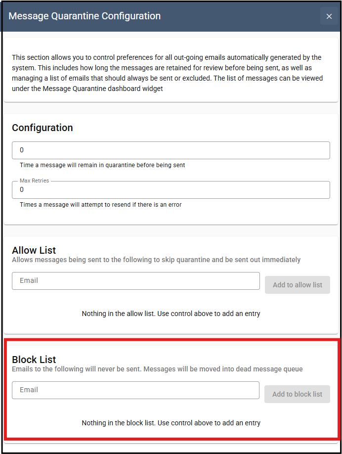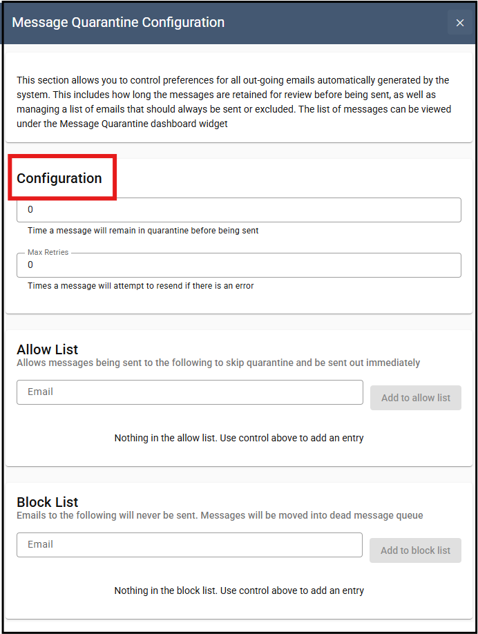 3. Within the Allow List section, add any email addresses to exclude them from the message quarantine time. Emails sent to these emaill addresses will be sent immediately and by-pass the quarantine time.