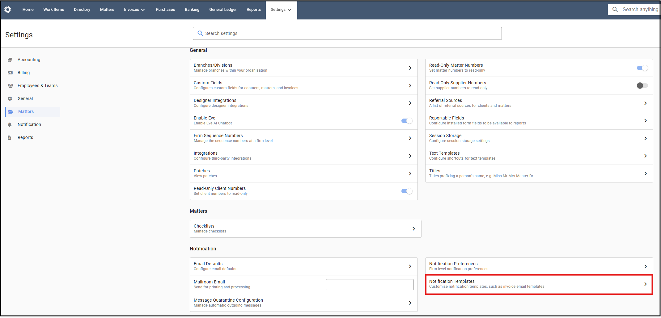 2. Navigate to the Notifications settings category, and select Notification Templates.