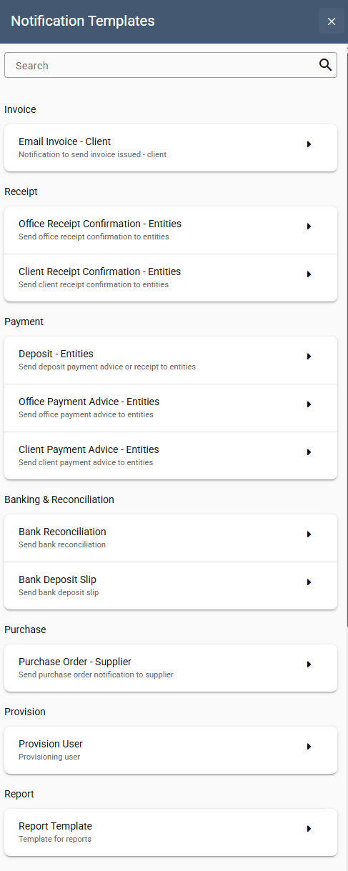 The notifications feature is designed to automatically distribute templated messages in bulk such as emailing Invoices and Receipts to clients. Notifications can also be used internally to notify staff of activities such as accounting reporting at the end of month.