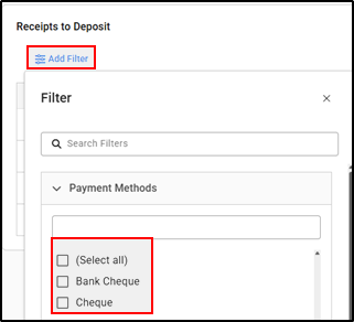 4. If you have multiple payment methods that require banking, you can use the filter to easily select the relevant payment types to include in your deposit.