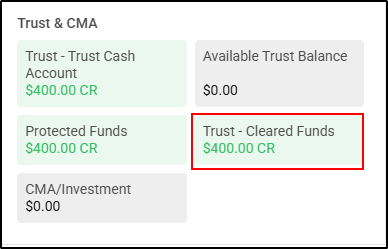 Note the balance displayed in the Client/Trust - Cleared funds balance financial tile.
