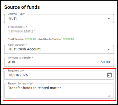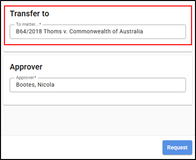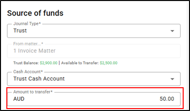 7. In Transfer To, search for the matter you wish to transfer funds to, by typing the Matter Number or Name into the Matter field.