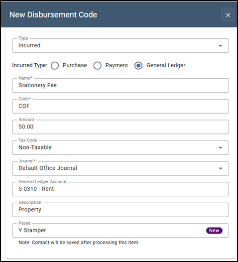 The General Ledger Disbursement type is similar to an incurred disbursement, except rather than creating a cashbook entry, the credit side of the transaction will be posted to a General Ledger (GL) account of your choice.