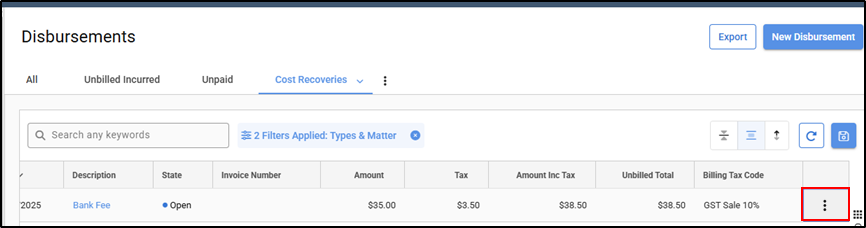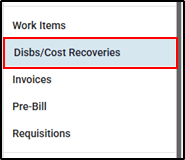1. Navigate to the Matter, select the Disbs/Cost Recoveries from the right hand side menu.