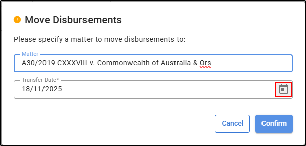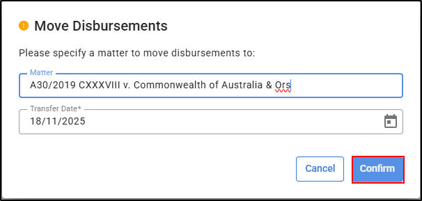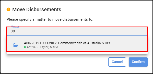 4. Start typing the matter name or number in the matter box to select the matter you would like to transfer this to.