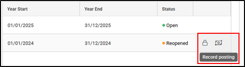 Once a year is reopened, adjustments can be processed via the ‘record posting’ option within the financial years and periods area. This will open a privileged version of the journal transaction screen, which will back date to closed financial periods.