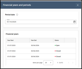 *When a financial year is closed, if the current financial period date is less than the year end date, then this will be updated to the first day of the new financial year. This means a financial period within a closed financial year cannot be open.