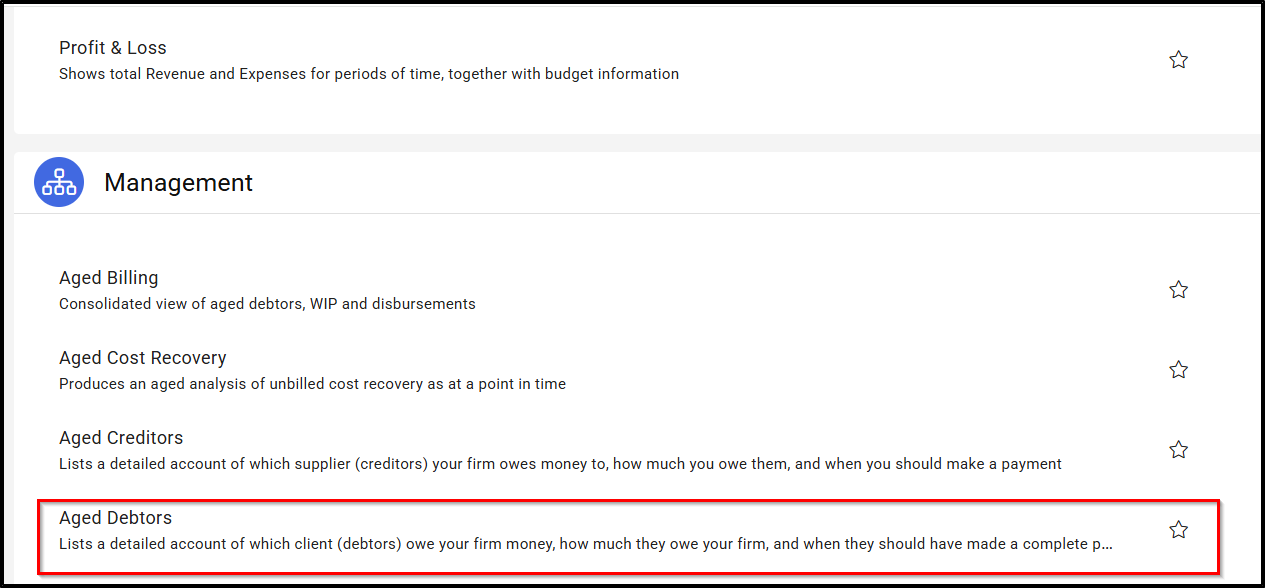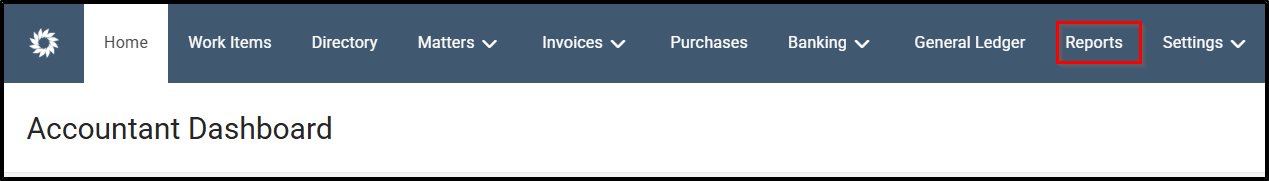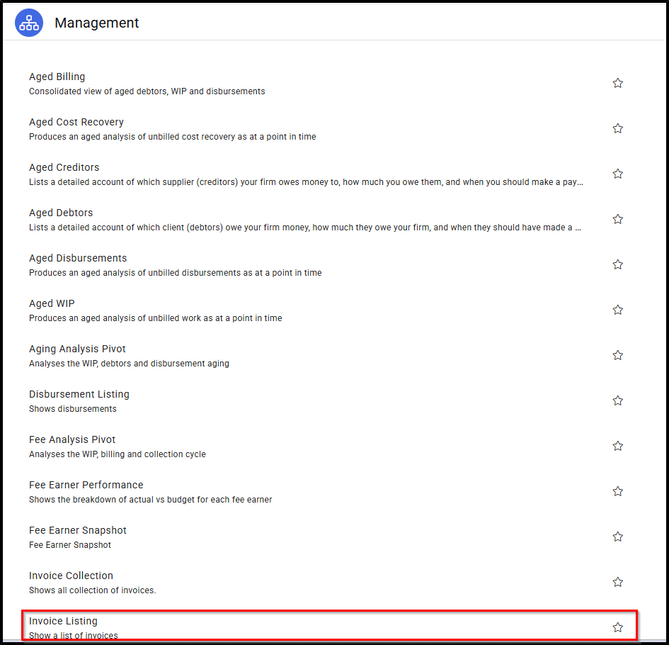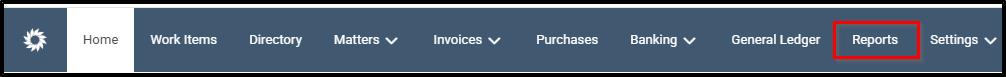 Prime offers various Accounting Reports relating to Invoicing. The Aged Debtors and Invoice Listing reports are available under the Reports menu. The Pre Billing Report is available from the Matter.
