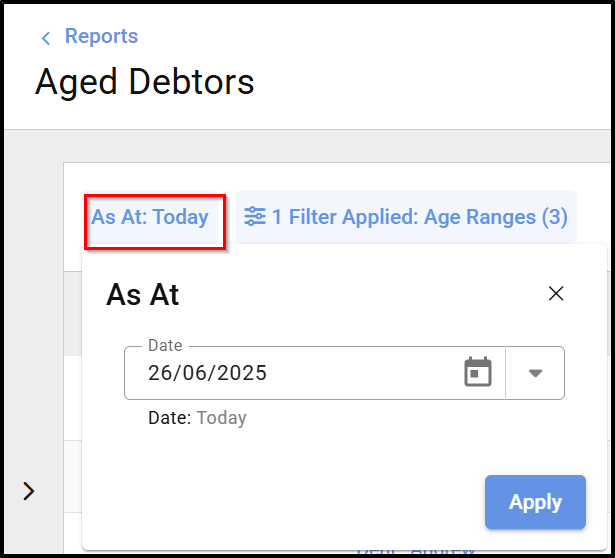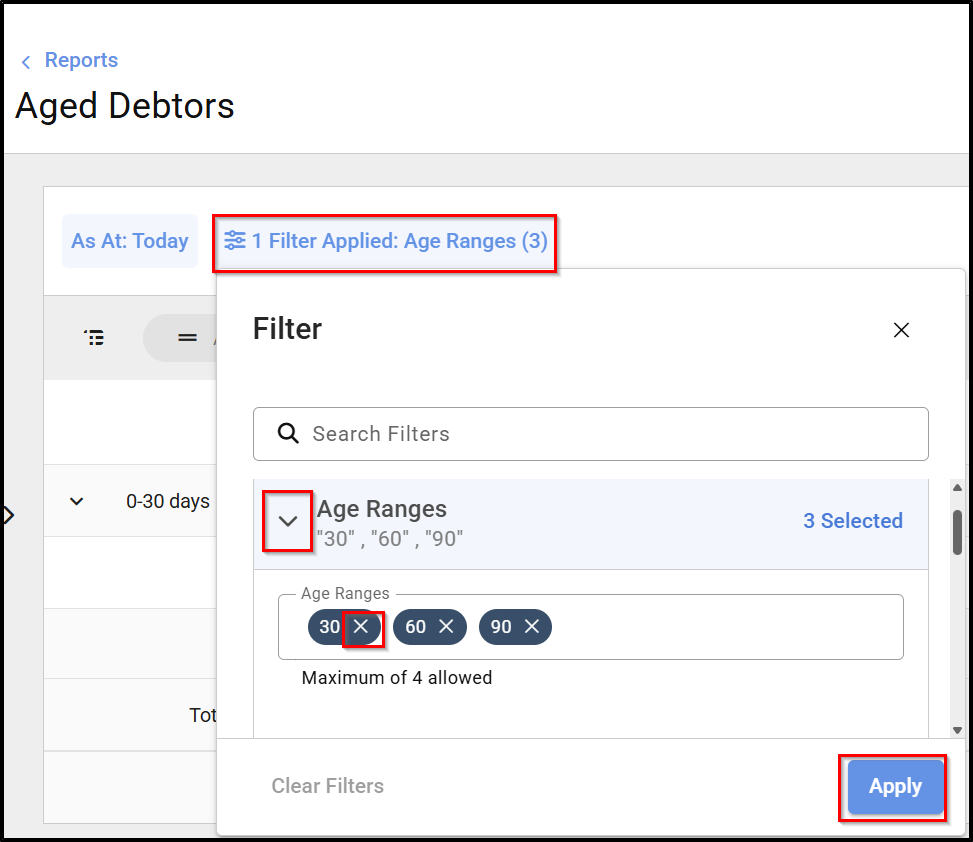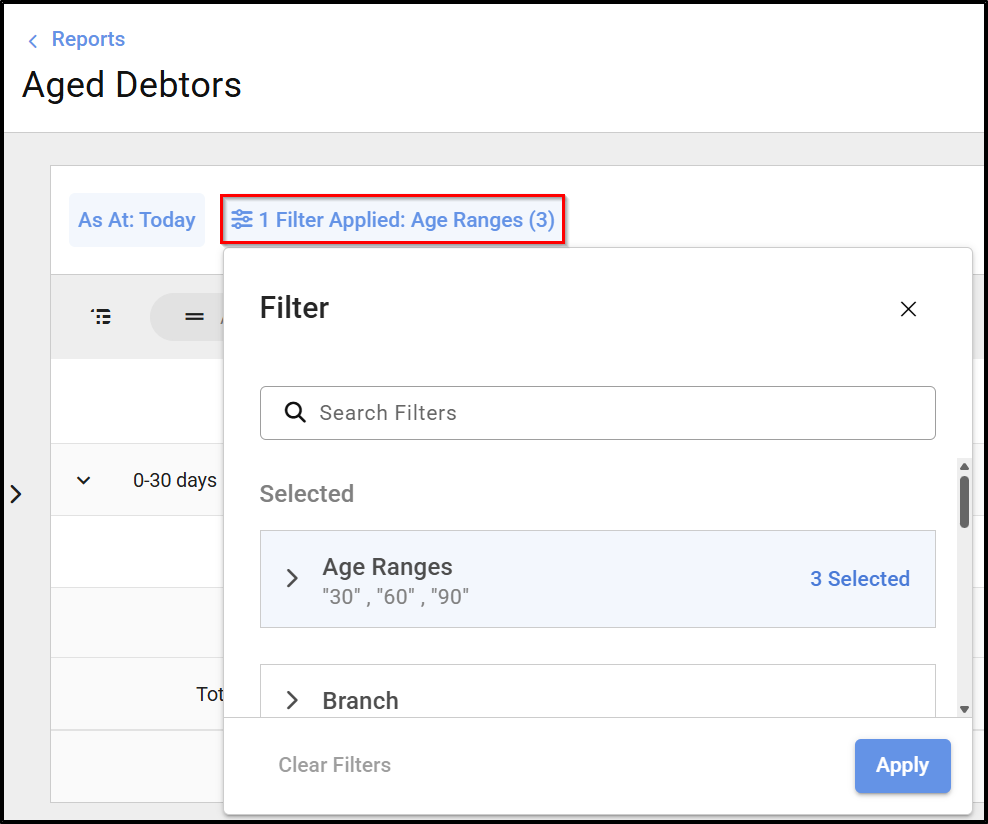 3. Within the Aged Debtors report there are various filters that can be applied to adjust the data that appears. To add a filter, select Add Filter.