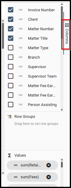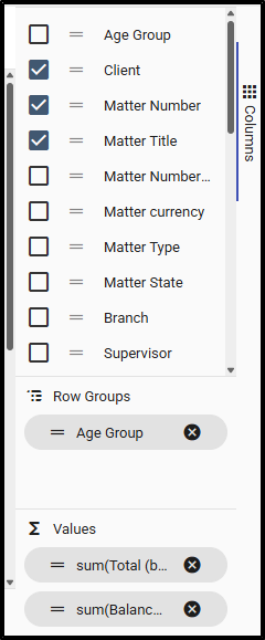 Column data can be unticked or added to and the grouping can be changed. To change the grouping, tick the column you would prefer t group by, then hover over the column name until you see a hand, grab the field and drag it down to the 'Row Groups' section