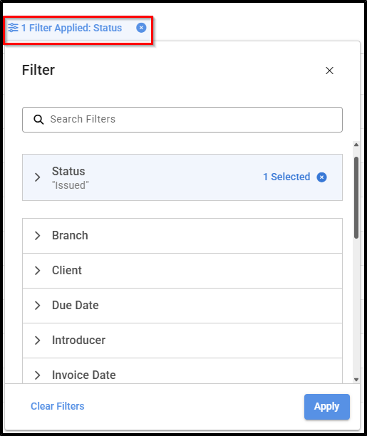 3. To add a filter to the invoice listing, select Add Filter. Once selected a list of filter options will appear.