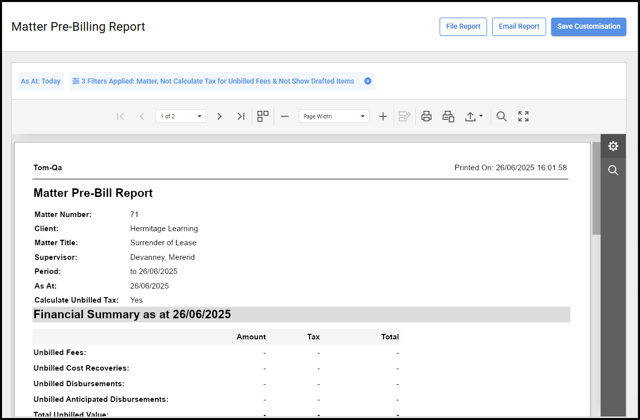 A Matter Pre-bill report shows a breakdown of financial summary of unbilled fees, disbursements and cost recoveries that are finalised to be billed.