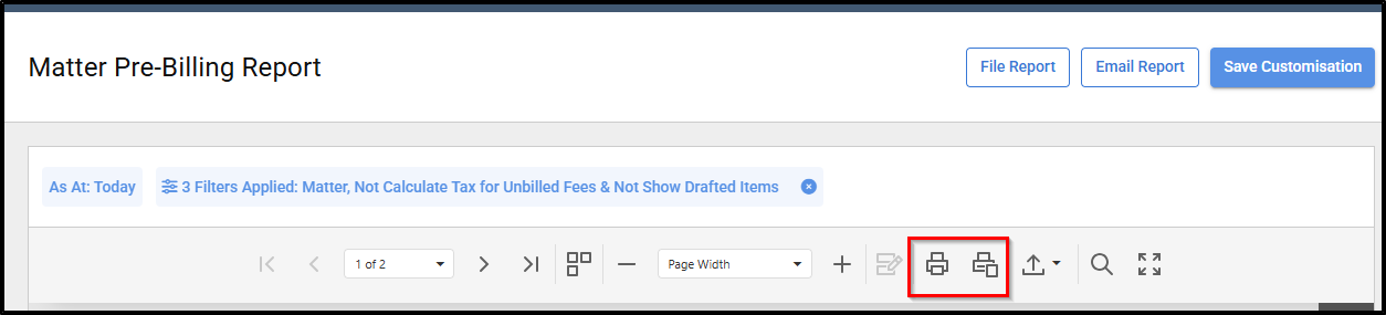 2. The Pre-Billing report will open on the screen. The default filters include Calculate Tax for Unbilled fees - Tax to be applied at time of billing and Show Drafted Items - includes unbilled items already included on a Draft bill, Matter denoting the matter you are currently in.
