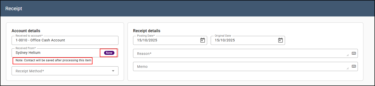 2. On the Receipt screen, the Received to Account field will pre-populate with the chosen cash account if you have recorded the receipt directly from the Office Account. Otherwise, select the relevant Office Account.