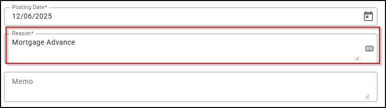 11. Enter a reason for the funds in the Reason field. Select Text template icon on right of the Reason field to update from available shortcut templates.