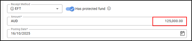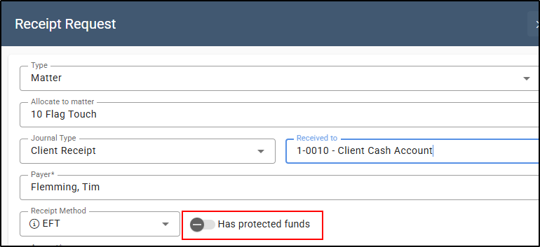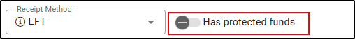 10. If the Receipt includes funds that should be protected for a specific purpose, click the Has protected funds toggle to the right.
