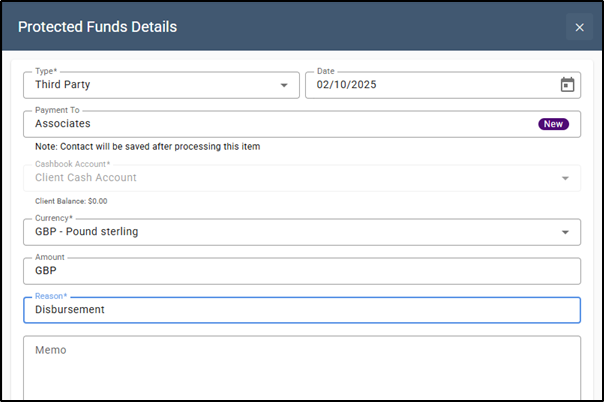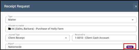 A Matter Receipt Request is used to notify the accounts team that monies have been received into the client/trust account for a Matter and require posting to the system.