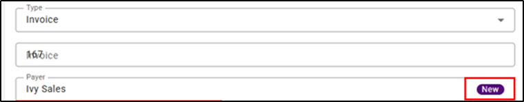 8. Start typing a name in the Payer field to select an entity from the directory. If the supplier does not exist, a purple New symbol will appear to the right of the field and a note under the field will inform the user that an entity card will be created.