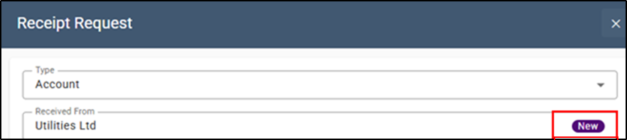 4. Start typing a name in the Received From field to select an entity from the directory. If the supplier does not exist, a purple New symbol will appear to the right of the field and a note under the field will inform the user that an entity card will be created.