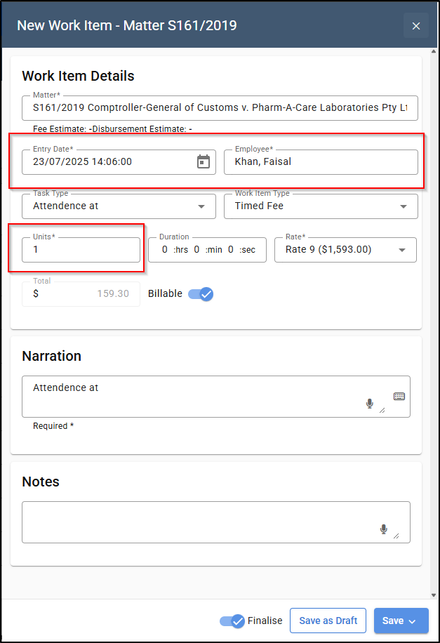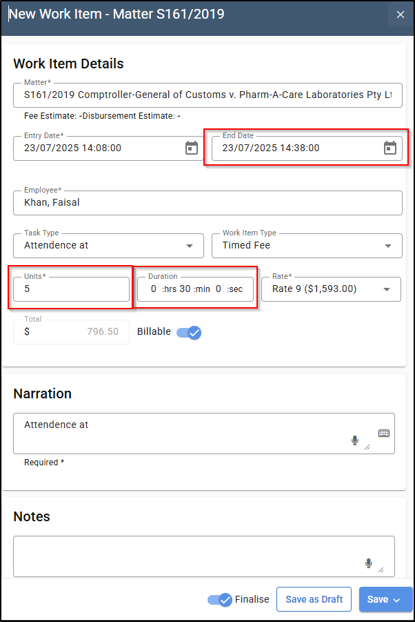 For staff members cloning a work item entry which needs to be for another employee, ensure you update the 'Employee' field set to the relevant employee (i.e. Fee Earner).5. Once you have updated the Units field, the system will automatically update the End date/time and Duration in accordance with the number of units. Similarly, if you update the End Date/time, the system will automatically calculate the Units and Duration.