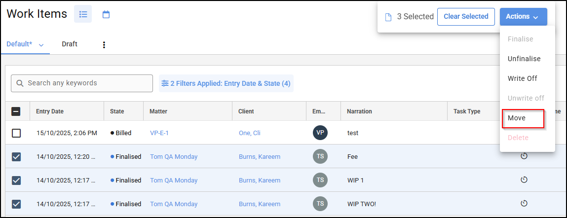 Note: If you need to move a work item which is included in a draft bill , the work item must first be removed from the draft invoice that it has been included on.