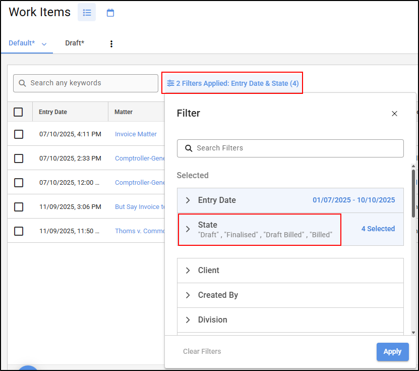 2. Apply the relevant filters to the work items listing, this includes adding the 'State' filter which allows you to view the billing status of the work items. Only Pending, Finalised or Non-billable entries can be moved to another matter.